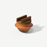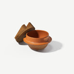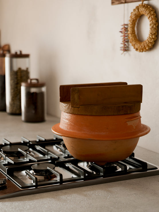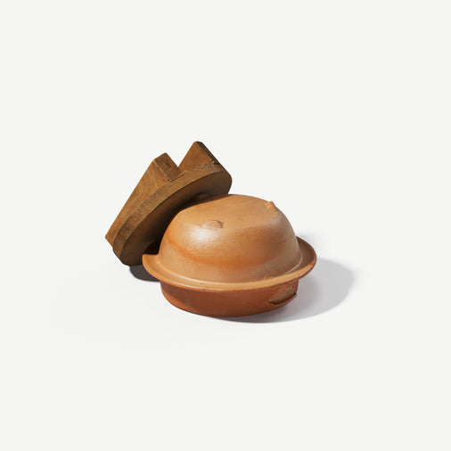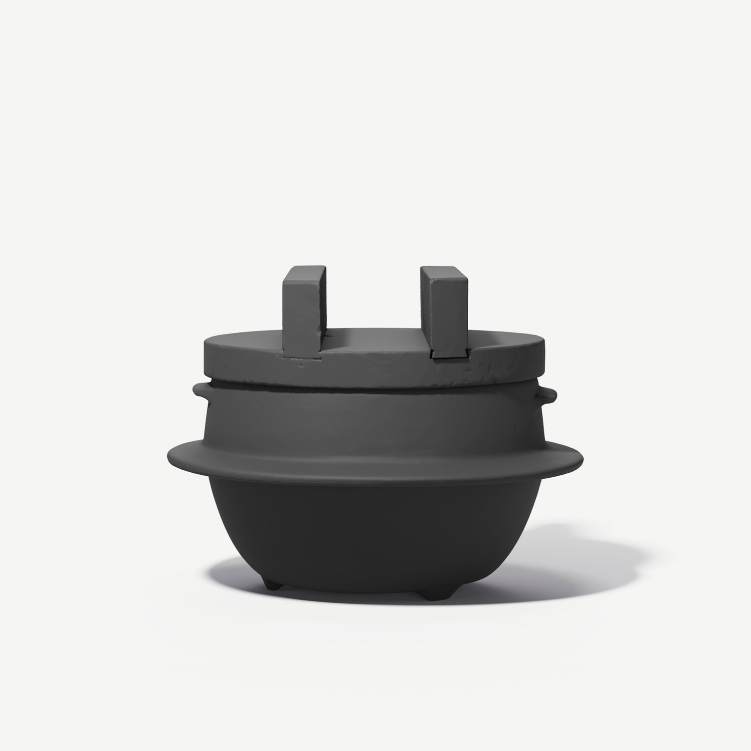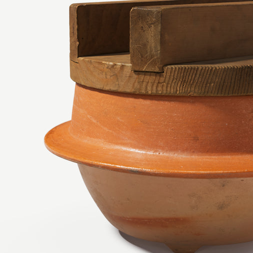 This is a ceramic rice-cooking vessel (hagama) produced in Japan during the Second World War, when metal resources were in short supply. Especially after the onset of the Pacific War, iron and aluminum were prioritized for military use, making it difficult to produce metal cookware for households. As a substitute, ceramic hagama were developed in various pottery regions across the country. The form closely resembles the traditional metal hagama, with a distinctive flared rim. Its thick walls offer excellent heat retention, though the material's fragility made durability a known limitation. Most examples are made from red clay, resulting in a warm reddish-brown tone. Some bear stamped marks from military supply facilities or manufacturing kilns. Today, these pieces are valued not only for their rarity, but also as quiet records of a time when daily life adapted to the pressures of war.