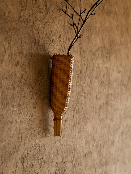 A finely handwoven bamboo flower vessel, designed to stand upright or hang on a wall.