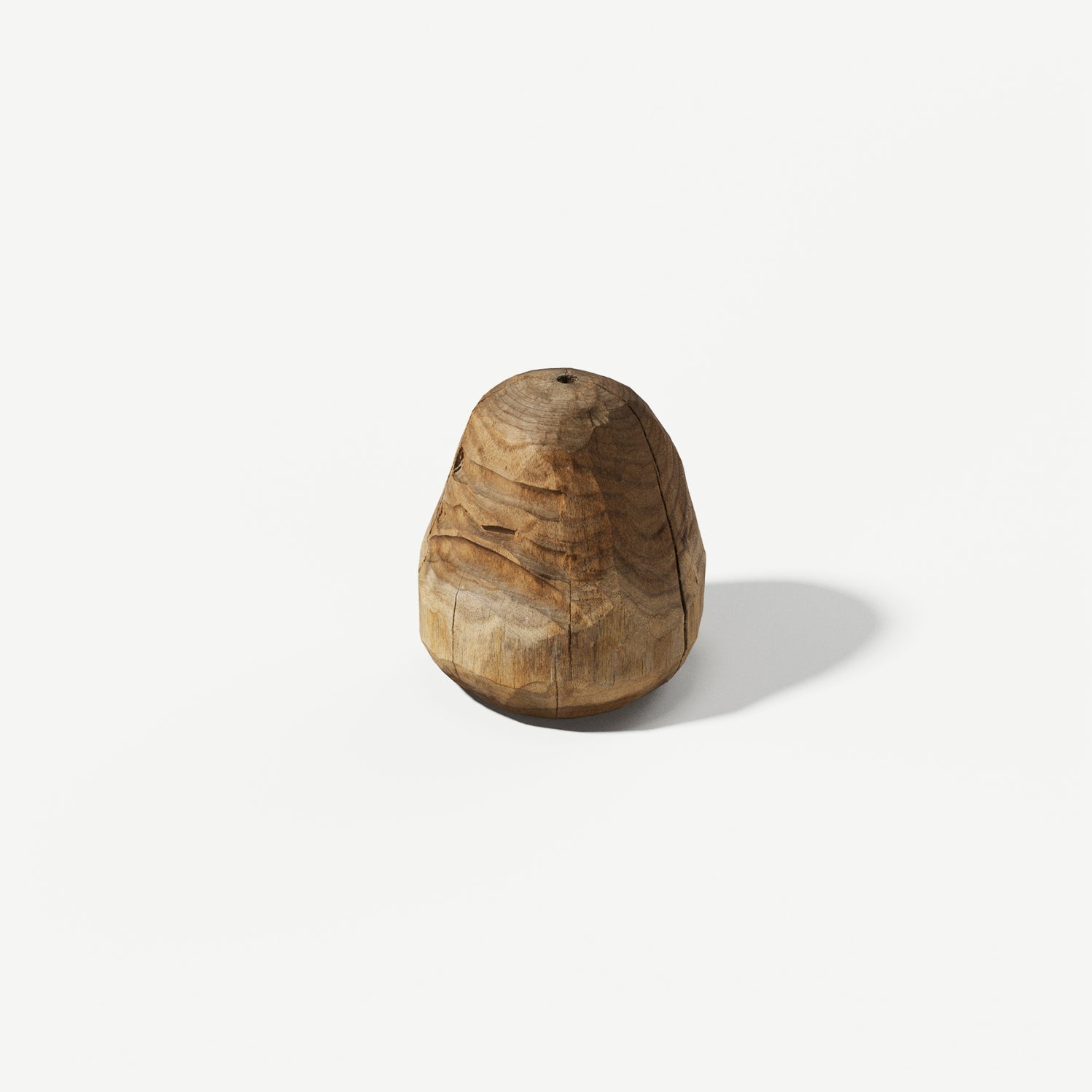 An unpainted wooden Daruma, roughly carved yet quietly expressive.