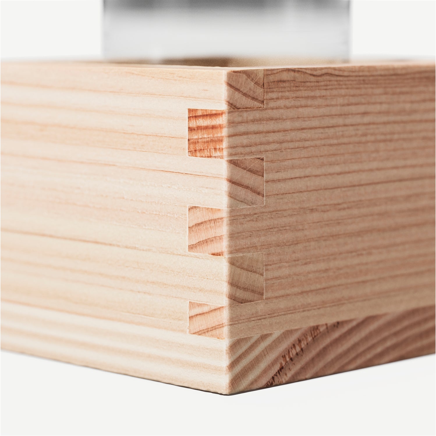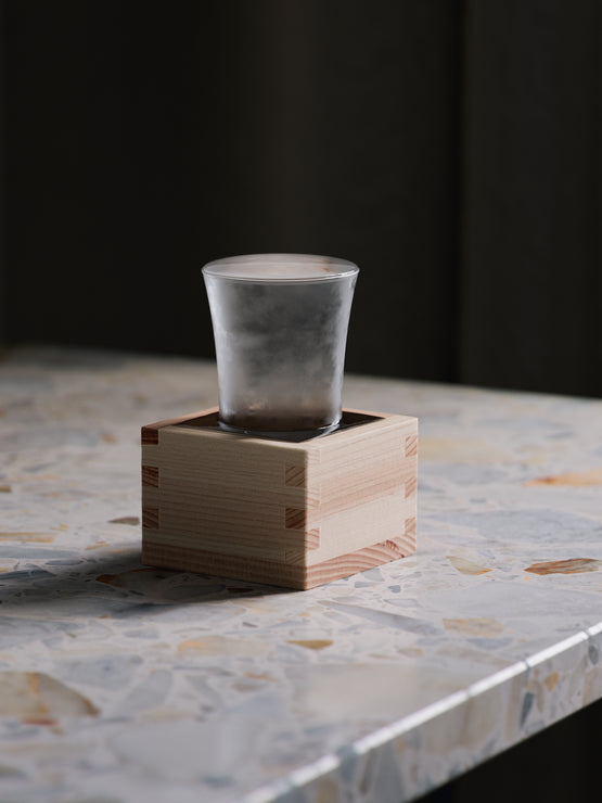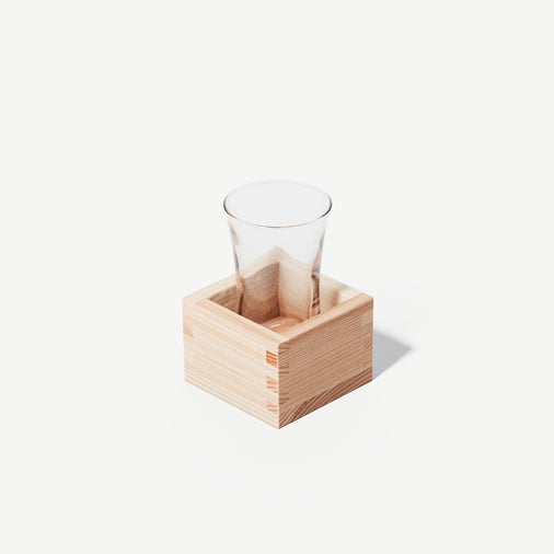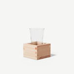 This set features a hinoki (Japanese cypress) masu and a clear glass, reflecting the traditional Japanese sake-serving style known as mokkiri.